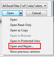 - Click the arrow next to the Open button and select Open and Repair from the dropdown.